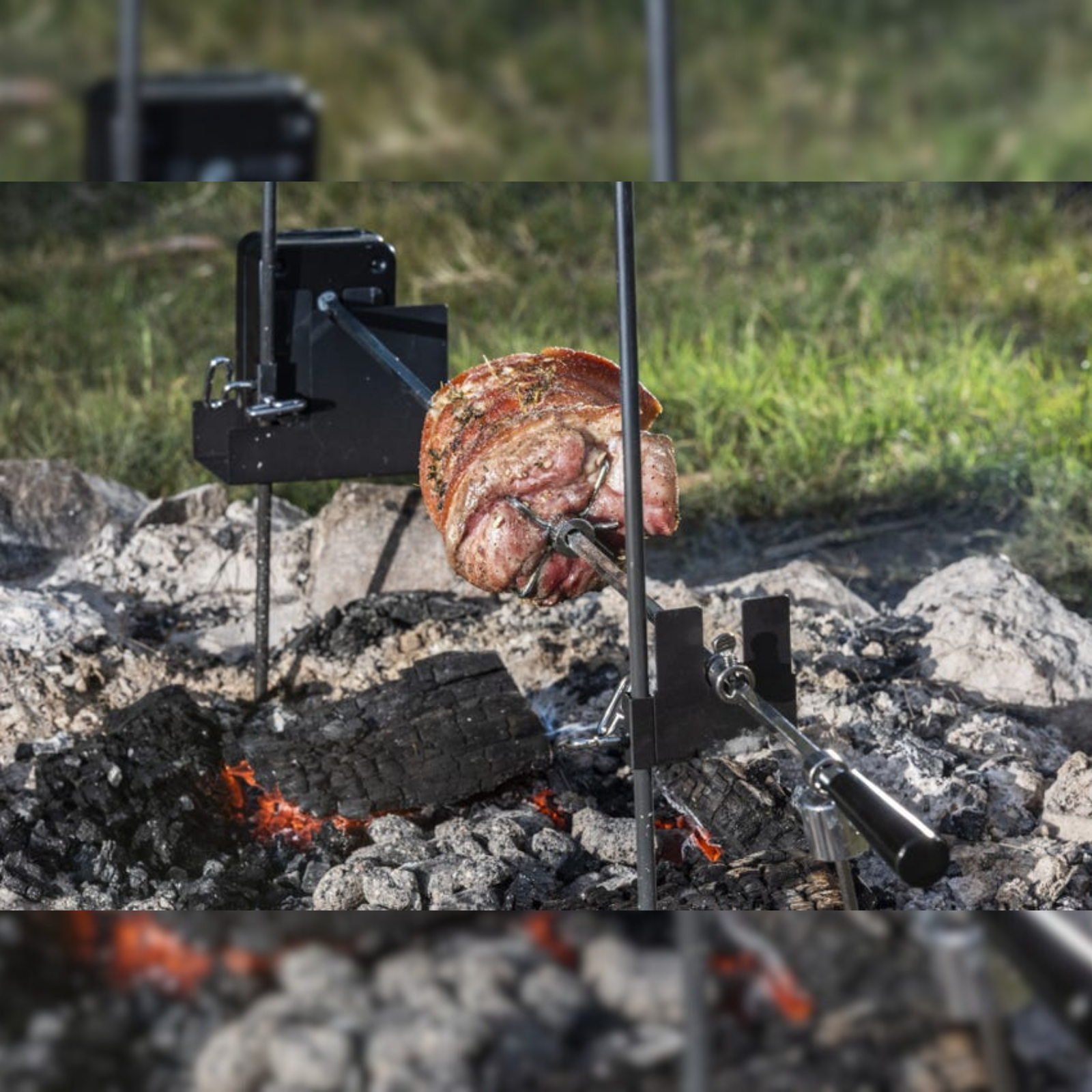 This camping rotisserie bundle is the perfect solution for outdoor cooking. Featuring two pairs of heavy-duty screw-together poles, a battery-powered rotisserie motor (2x D batteries required), and multiple shaft lengths for flexibility, this kit is ideal for camping or picnics. It accommodates up to 4kg loads and offers a maximum height of 90 cm. With heavy-duty prongs and adjustable shaft lengths (750mm, 900mm, or 1200mm), this portable spit kit makes open-fire cooking easy and convenient. Batteries are not included.
