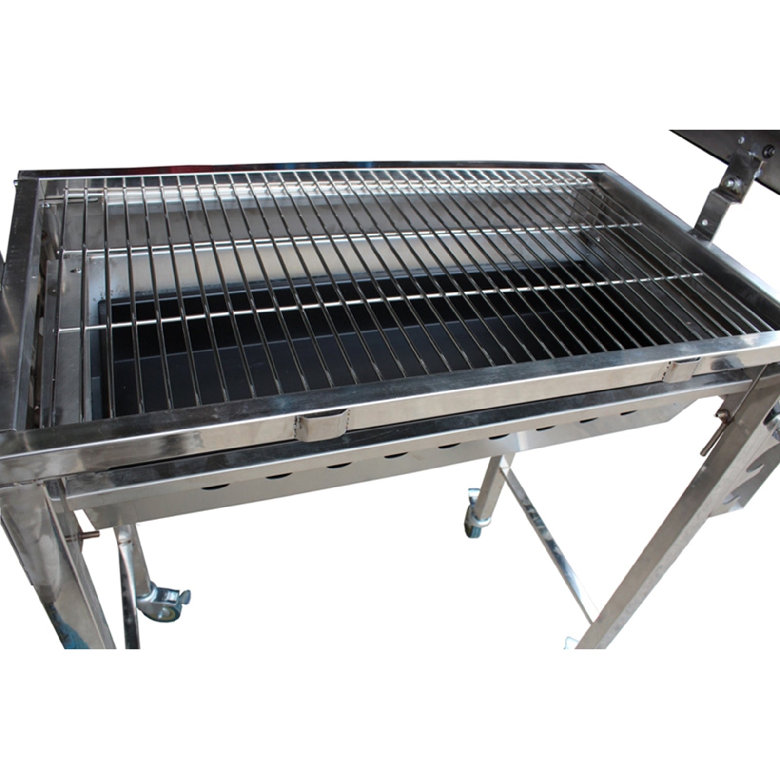The new Stainless Steel Cyprus Grill is a larger style Cyprus Grill unit, made longer and wider than the typical deluxe auto model, and designed to cook more of your meat evenly and conveniently. It can easily cater to most meat types including beef, lamb, chicken, goat, and pork. The heavy-duty large metal construction allows for high usage, and its size allows you to cook for a large number of people in a quicker time than the smaller models in the range. Stainless steel legs with lockable wheels easier to move from place to place and 2 wooden handles on the side of the grill - 87 cm in height from the top of the base to the ground.